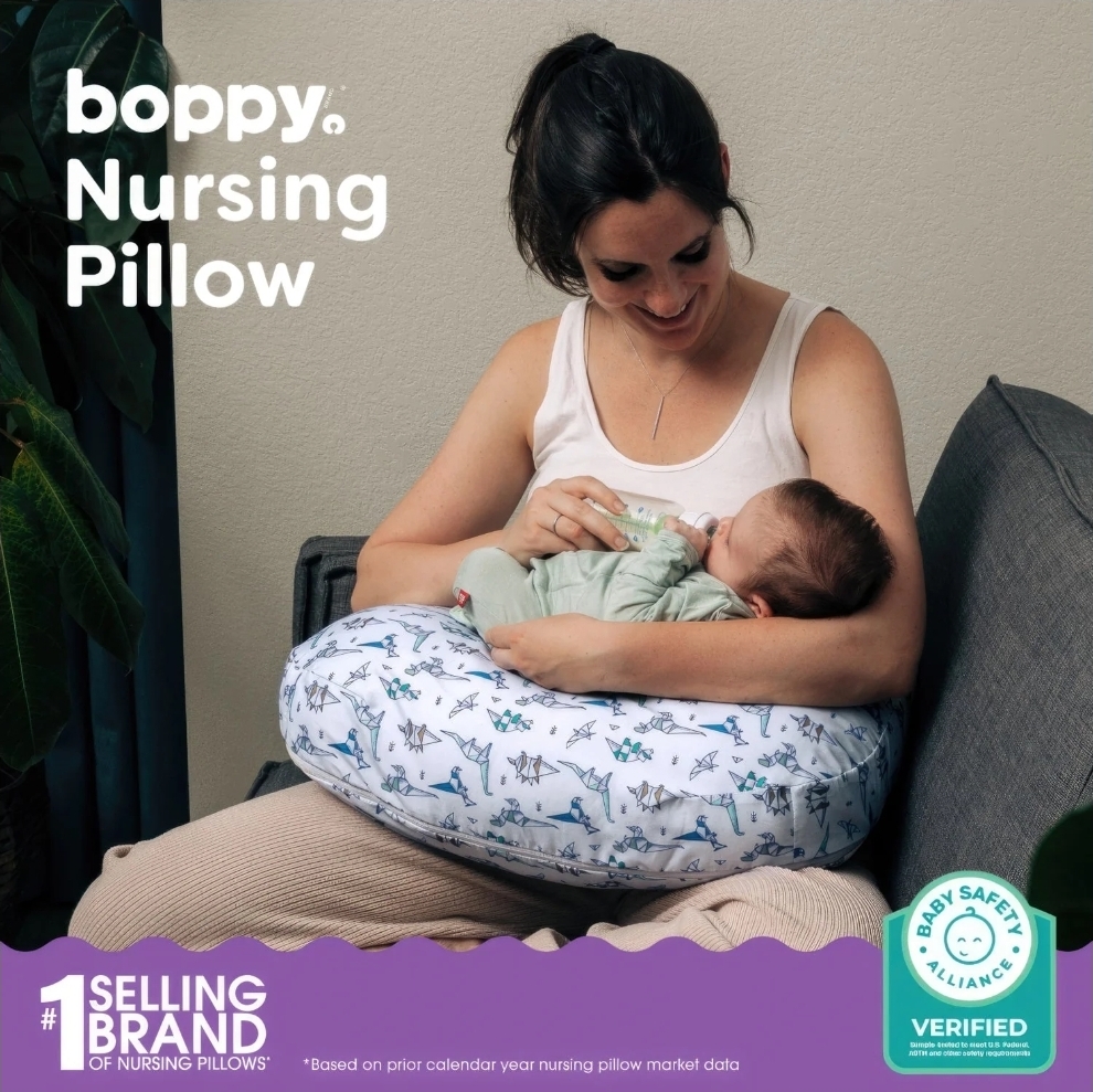 The beloved Boppy® Nursing Pillow is designed to make feeding time more comfortable, supportive, and stress-free for both you and your baby. Its firm, ergonomic, patented design offers a higher surface to bring baby closer, reducing back, neck, and shoulder strain of parents during bottle or breastfeeding. The spacious, supportive surface helps position baby at the right height for a better latch in multiple feeding positions. Filled with hypoallergenic recycled fiber, it maintains its supportive shape over your entire feeding journey.