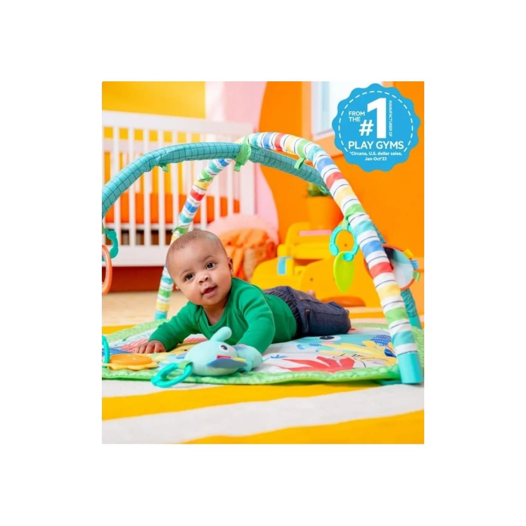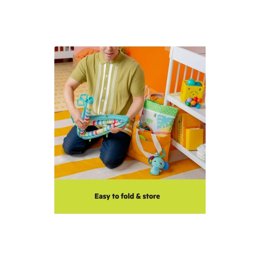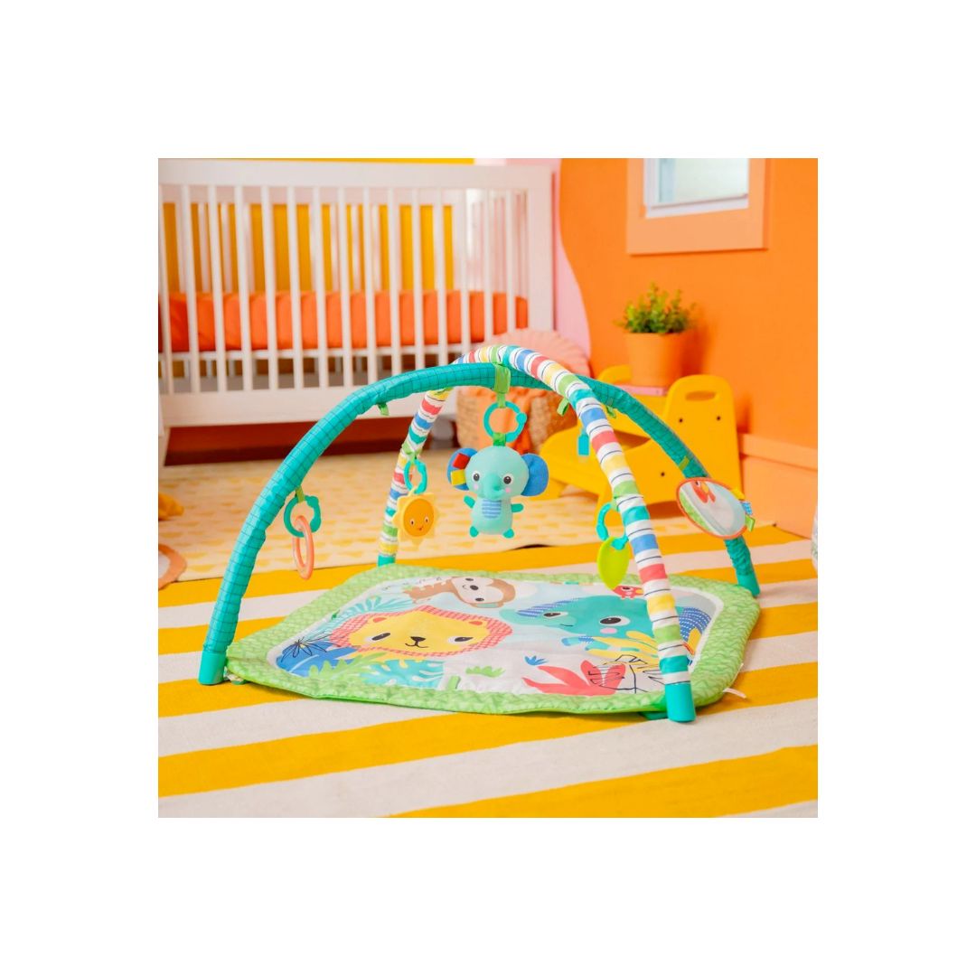 Make playtime a sweet safari of activity with the Wild Wiggles Activity Gym from Bright Starts. Your king or queen of the jungle will love to kick, lay and play on this tummy time mat! With a new, space-saving FoldAway toy bar and 5 toys included, there’s so much fun in one compact space. Includes plush musical elephant toy, tummy time mirror, sun rattle, leaf toy, and ring rattle. The elephant pal plays 4 melodies to entertain your infant.