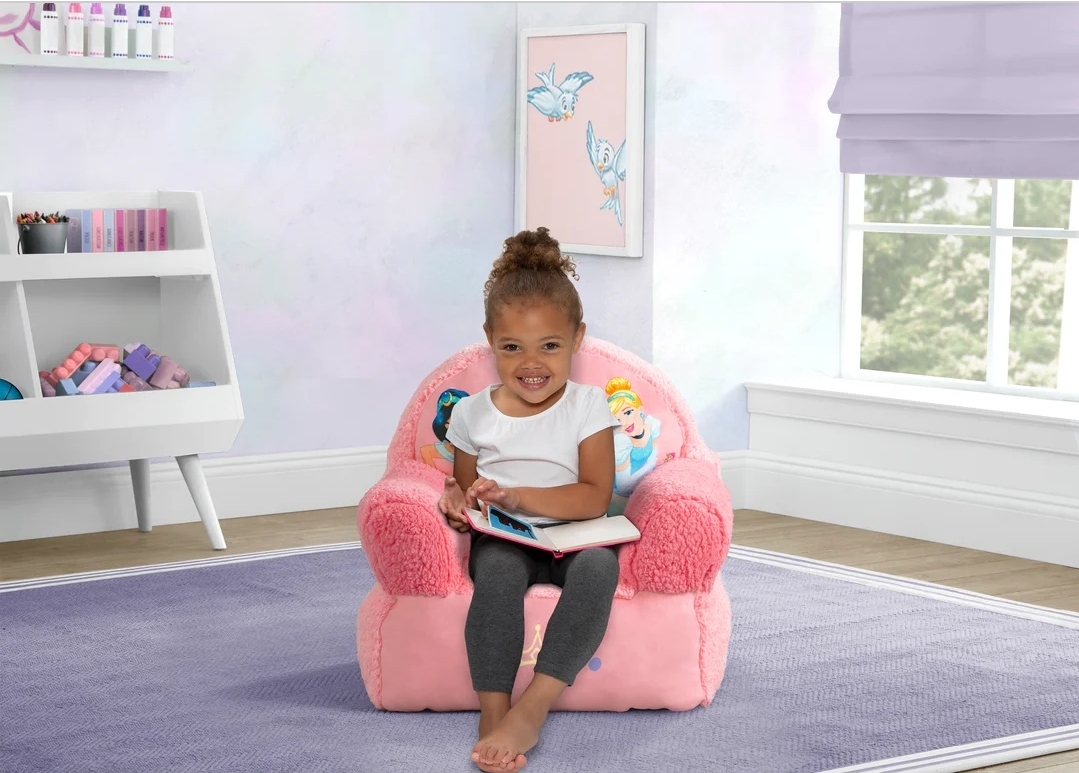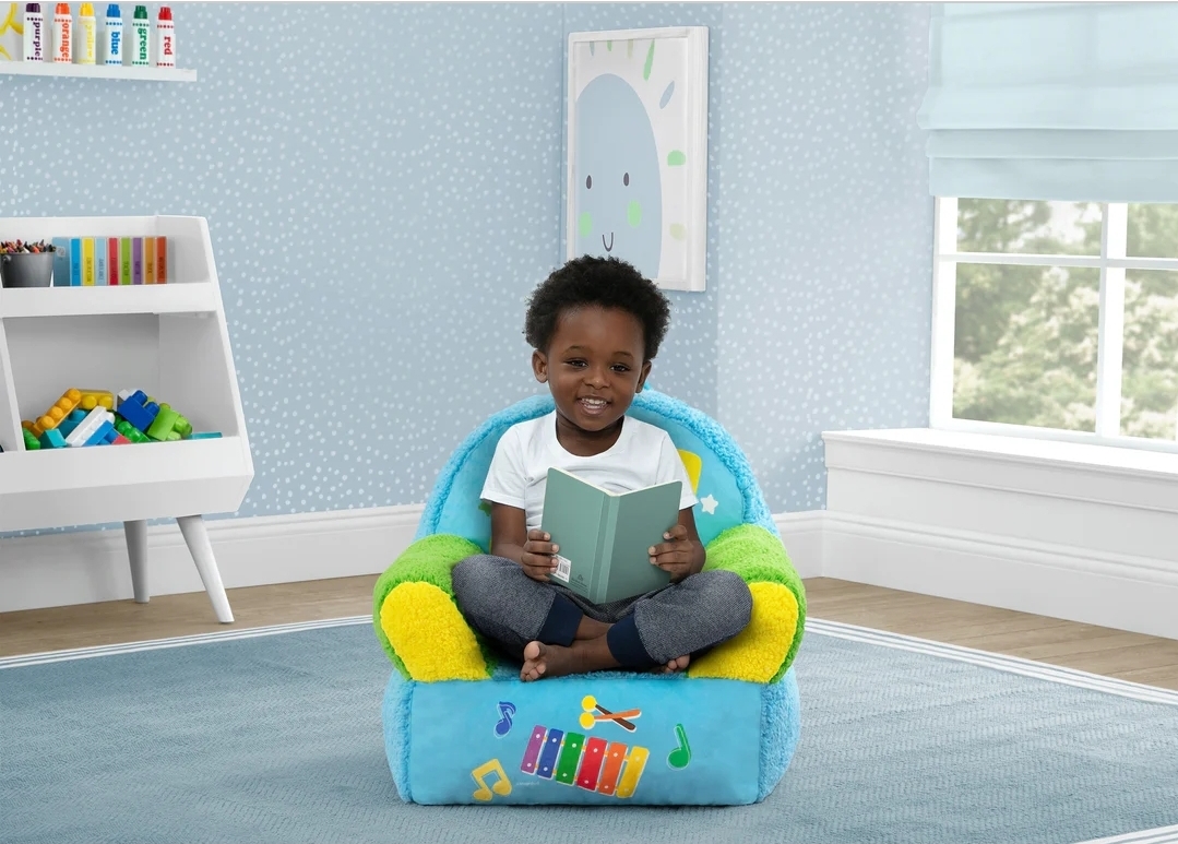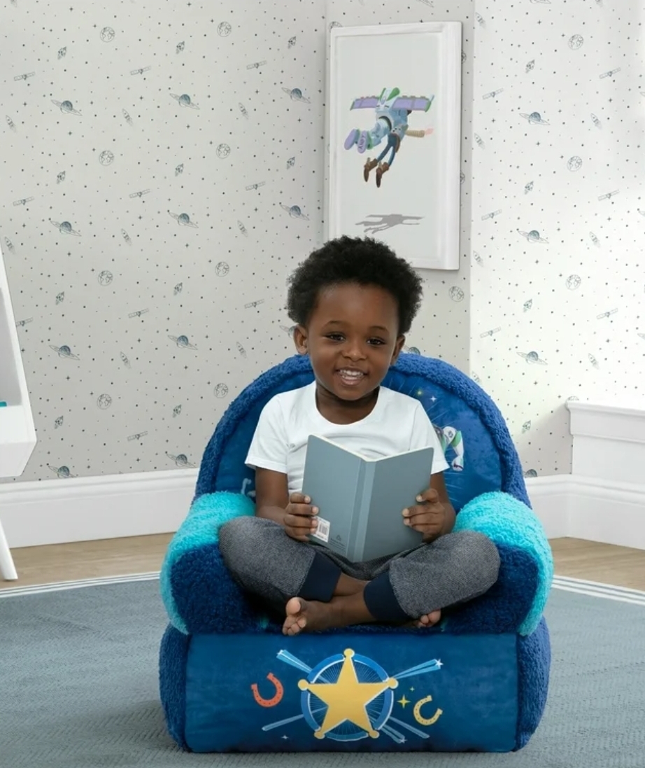 The ultimate playmate, the Buddy Chair by Delta Children is comfy and durable. This plush chair features colorful graphics, super-soft sherpa detailing, and an easy-to-grab handle that makes it easy to move around the house! The foam design of this comfy chair offers kids a cozy companion for reading, relaxing or snuggling, making it perfect for playrooms and kids bedrooms.
