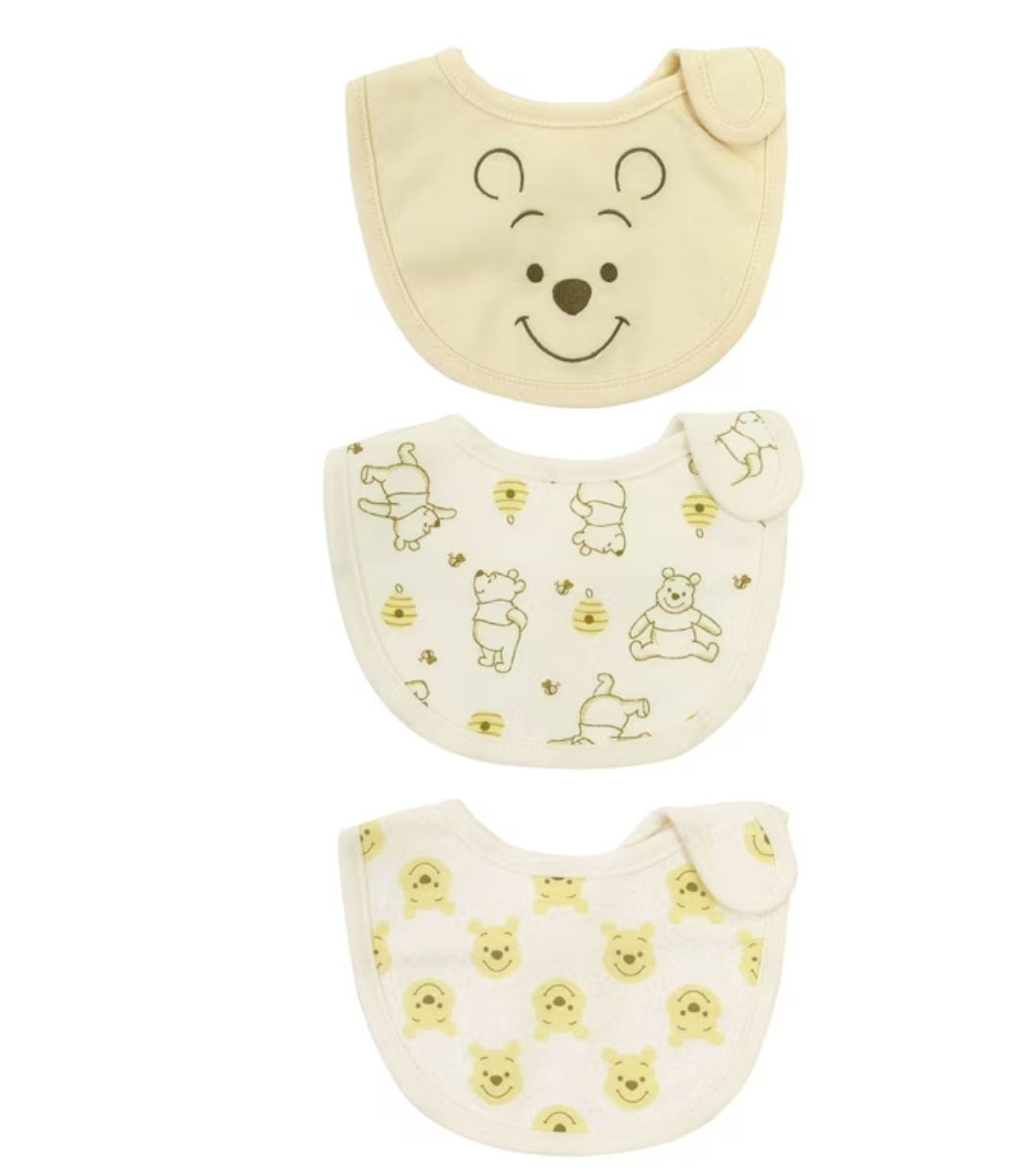 Disney Winnie the Pooh 3 Pk. Newborn Side Closure Bibs – Disney’s beloved Winnie the Pooh is front and center in this 3 PC newborn side closure bib set. A center Winnie the Pooh face embroidery is paired with 2 soft prints all featuring Winnie the Pooh. All bibs feature a 3 layer construction for extra protection against drools, dribbles and stains. A soft cotton knit front is paired with an absorbent knit terry backing and each bib has an extra inner water-resistant lining to prevent leak-through.
