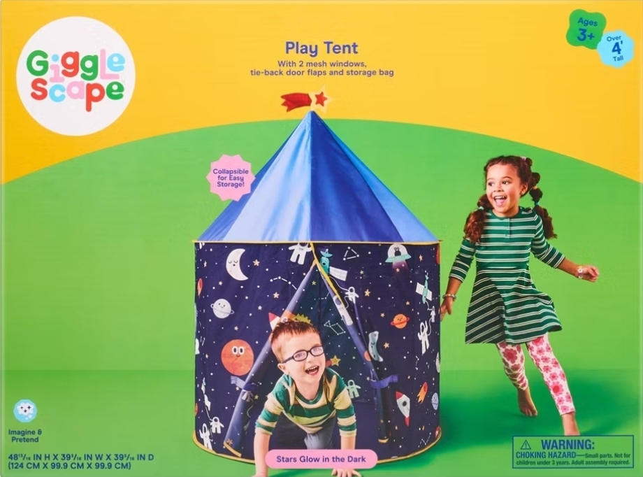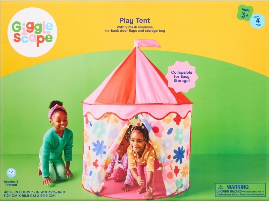 This Play Tent from Gigglescape™ gives your kids a fun space for imaginative play. Standing over four feet tall, it has two mesh windows to let them peek out and tie-back door flaps, and it also comes with a handy carrying bag for easy storage and portability.