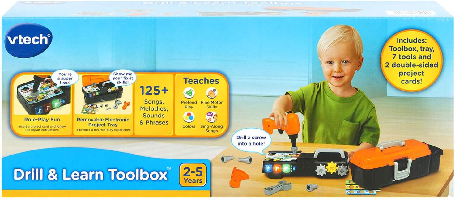 Fix and play with the Drill & Learn Toolbox™ by VTech! Open this toddler-friendly toolbox and get ready for role-play fun with the included electronic fix-it tray, working toy drill, hammer, wrench, nails and screws. Pressing the light-up buttons on the tray will trigger cheerful songs and introduce your little one to a variety of tools, how they’re used and the sounds they make. Kids will love turning the colorful gears to hear clicking sounds or using the working toy drill to make them spin. Insert the double-sided instruction cards and learn about colors and numbers while pretending to make repairs. Discover tons of fix-it fun with this learning toolbox!